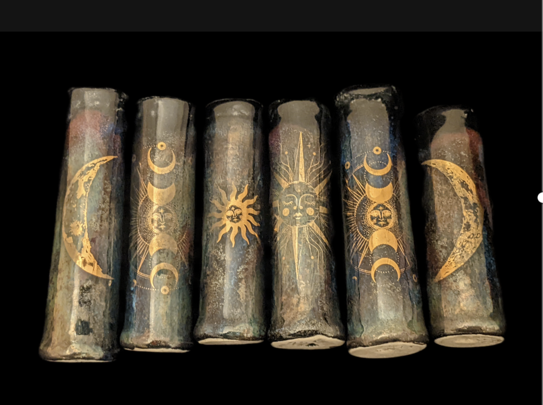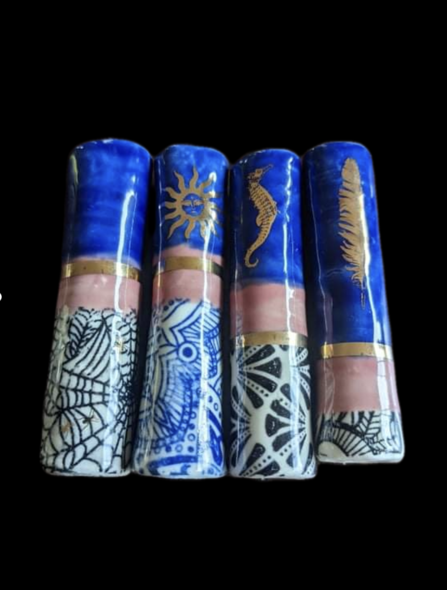 I have made some ceramic joint holders for Mal’s shop. The joint fits in one end, and the smoke inhaled from the other end is cooled to give you a more comfortable experience. Each one is a unique, wheel-thrown piece. The metallic designs are 22 karat gold.